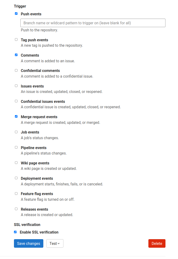 • From the left navigation pane of your GitLab repository, go to settings –> Webhooks tab.